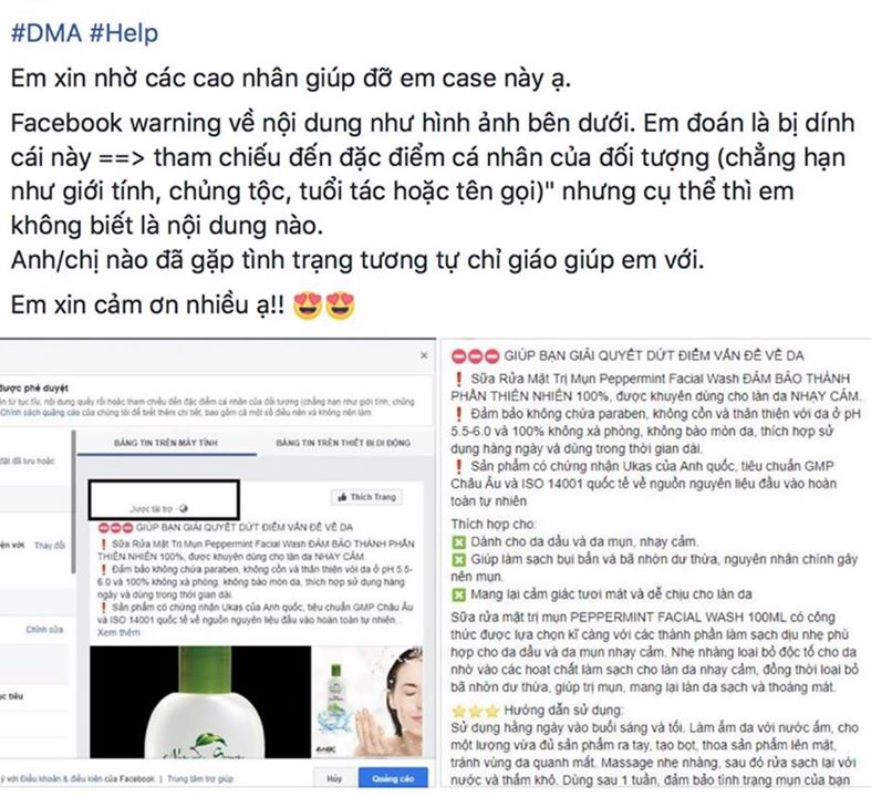 Đây có thể nói là lỗi phổ biến và kinh điển nhất đối với quảng cáo ngành Sức khoẻ-Làm đẹp. Quan điểm của FB như sau: khi bạn làm nội dung, không được ám chỉ người đang đọc bài quảng cáo có một đặc điểm nào đó. Ví dụ: